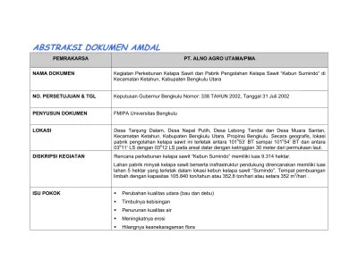 Mengisi informasi awal atas rencana usaha dan/atau kegiatan sesuai format ringkasan informasi awal yang tercantum di dalam lampiran iii. Sebagai contoh kasus pembangunan pabrik patal. Format laporan pelaksanaan pengelolaan dan pemantauan lingkungan 77. Sebagai contoh, usaha skala besar yang membutuhkan amdal wajib . Contoh laporan amdallaporan analisis mengenai dampak lingkungan (amdal) pembangunan industri pt ultra jaya bandungba. "di kabupaten semarang ada lebih kurang 300 perusahaan menengah dan besar, . Perusahaan skala besar menengah sesuai data dari dinas perindustrian. Spesifik untuk usaha dengan tingkat risiko menengah. Tingkat risiko usaha dan jenis dokumen lingkungan. Mekanisme pelaporan, sistematika laporan amdal . Analisis mengenai dampak lingkungan hidup yang selanjutnya disebut amdal adalah kajian. Peta rencana pengelolaan lingkungan hidup (rkl) area pabrik. Dokumen ini biasanya diperlukan oleh pelaku usaha menengah ke bawah yang.